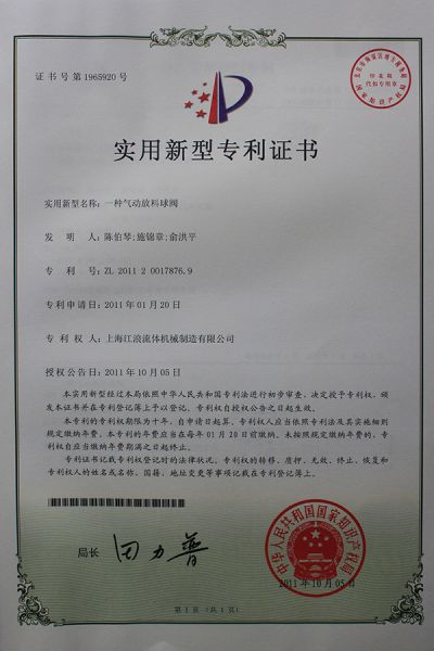 气动放料球阀实用新型专利证书