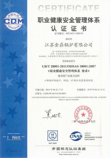 职业健康安全管理体系认证证书